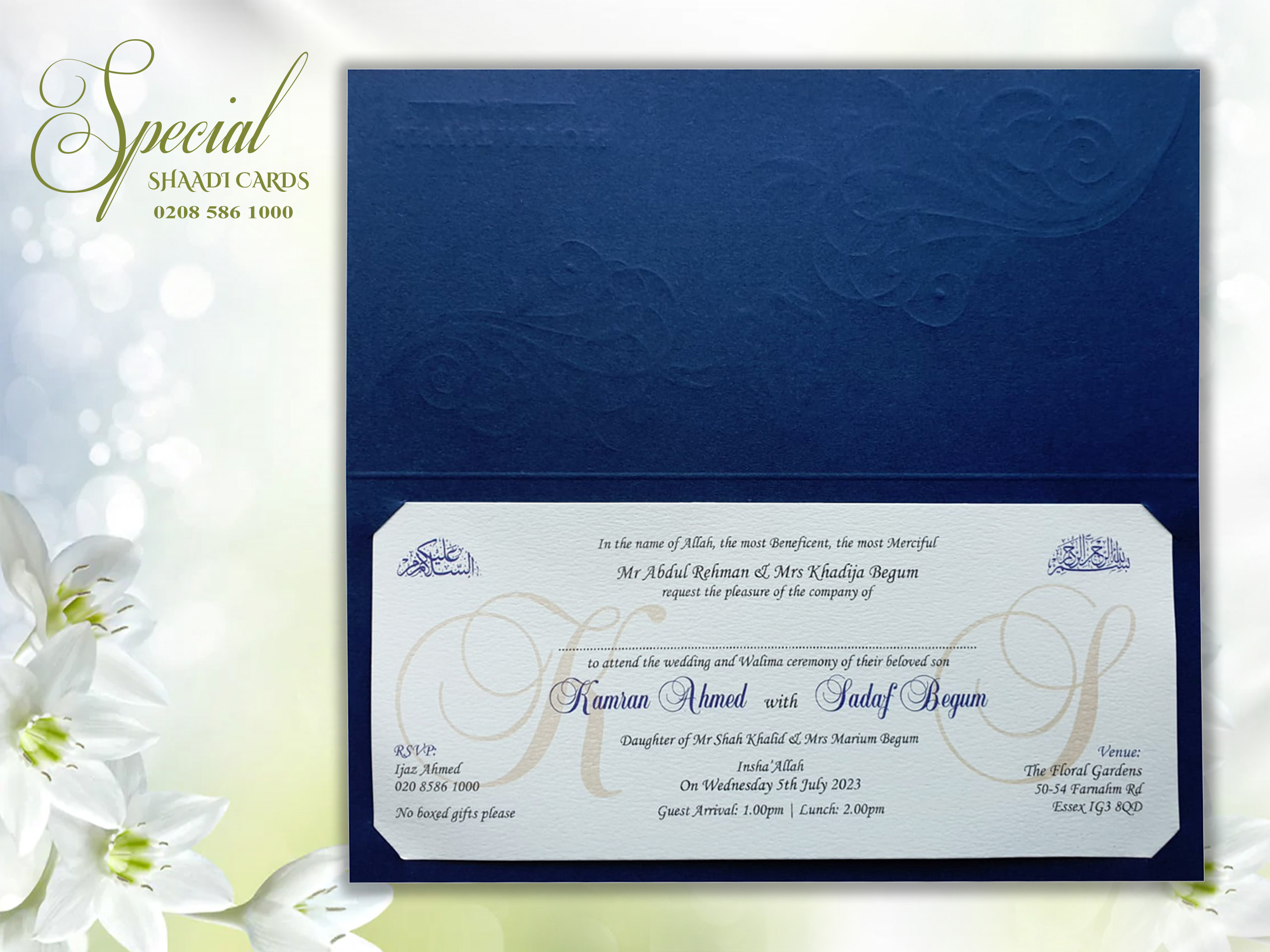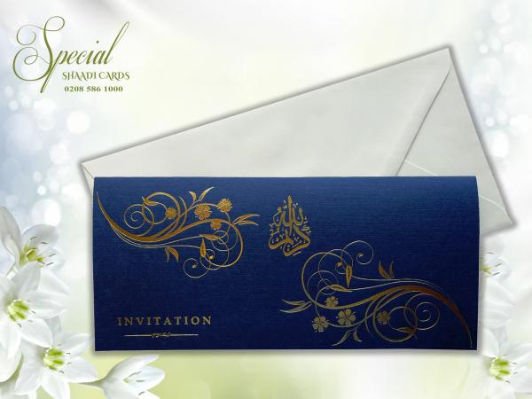 Blue Muslim Wedding Invite with Gold Foiled Pattern