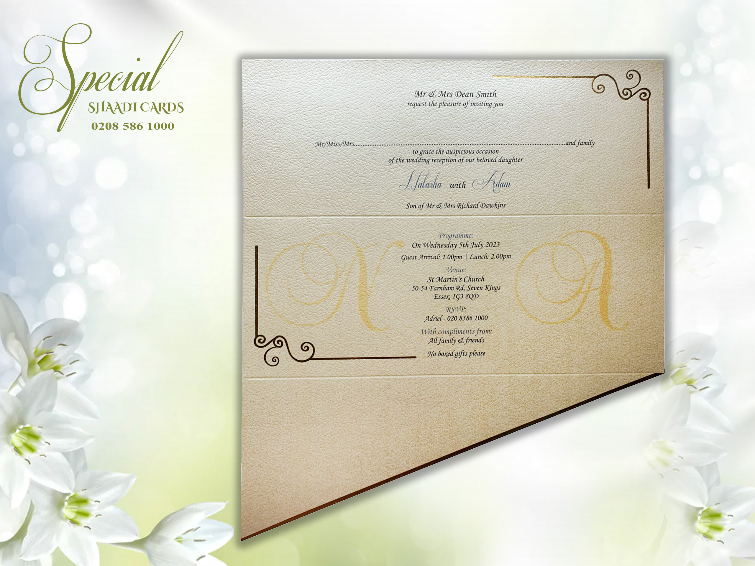 This card is supplied with an envelope and is personalized with your details. The printing is done on the card itself instead of a separate insert. Additional inserts can be purchased for other functions or to add more information such as directions or RSVPs. If you require additional inserts please also add that product to your cart. All our products are printed in the UK at our London warehouse. Please pop in to see the cards for yourself.