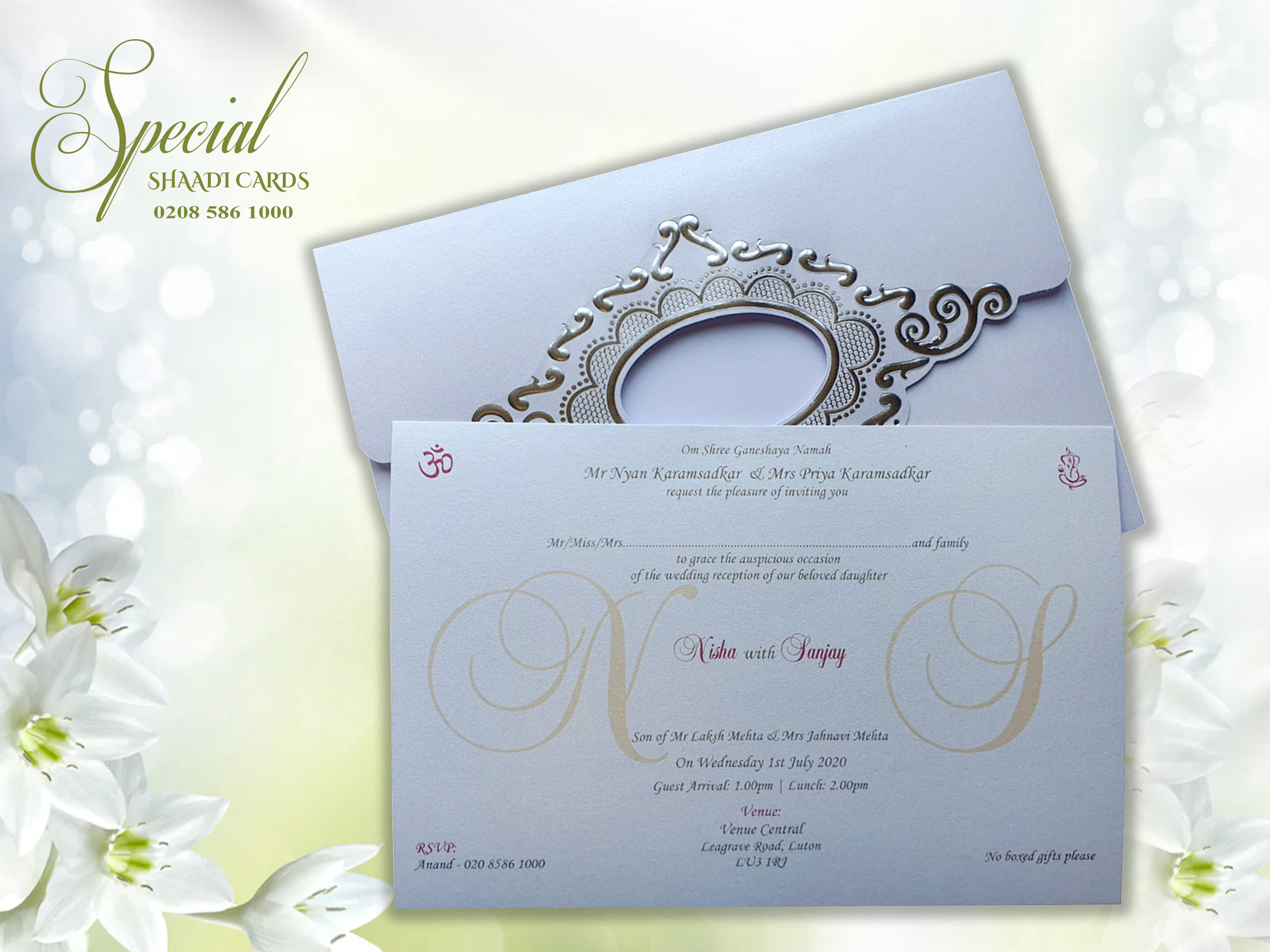 White Envelope Wedding Card with Silver Foiled Filigree