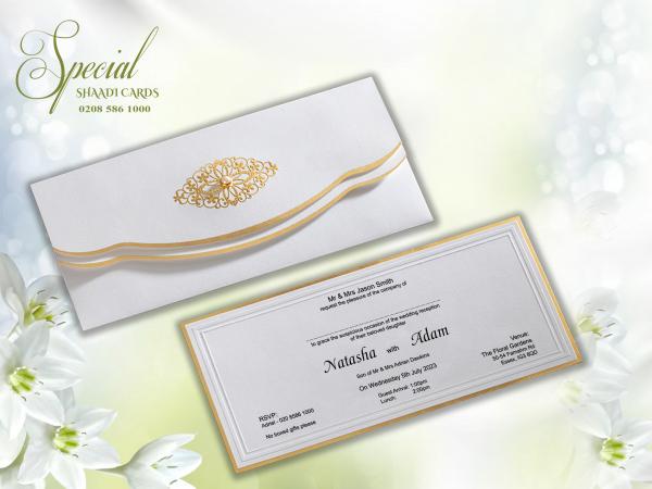 White Wedding Invite with Gold Foiling and a Pearl