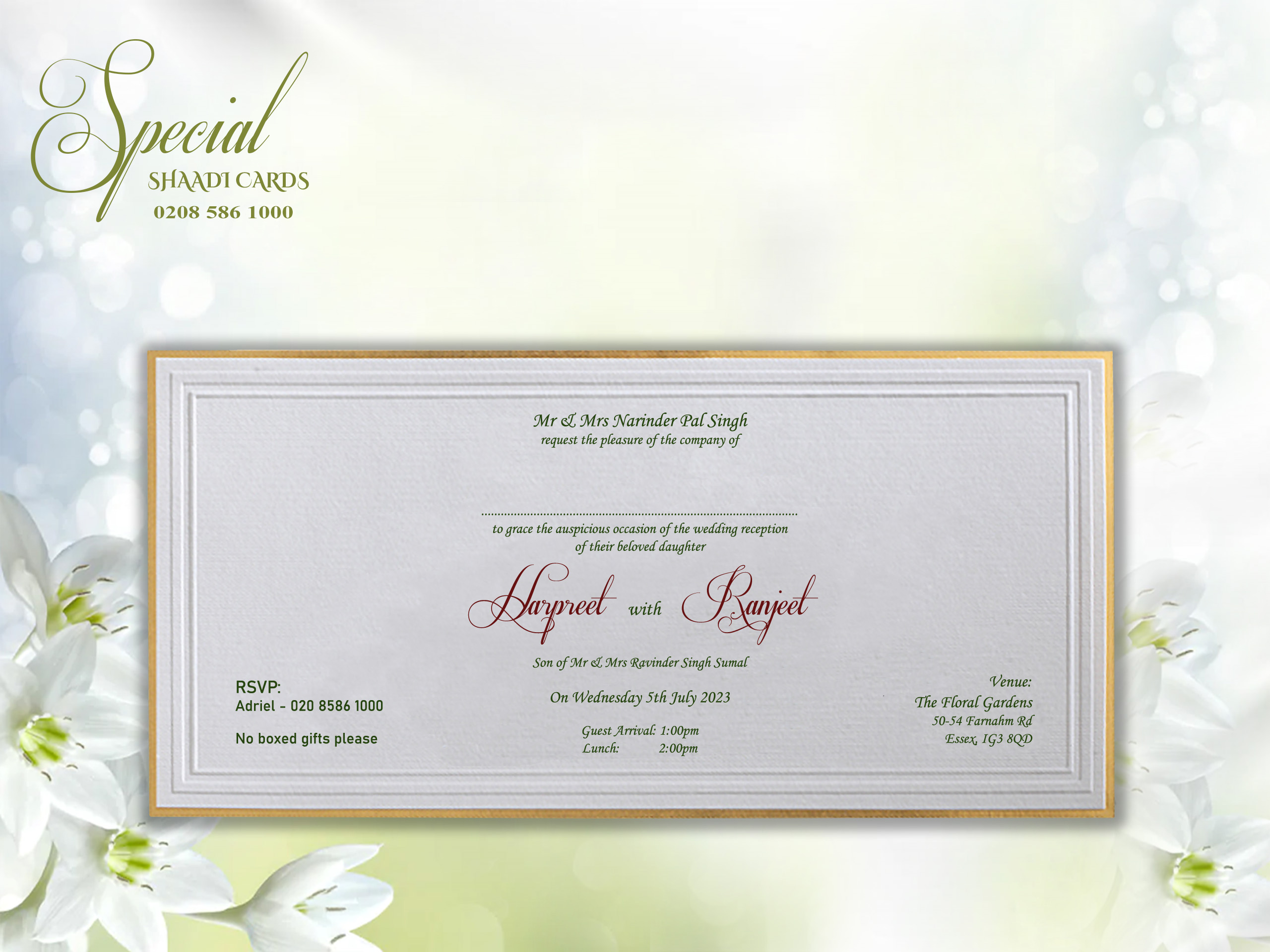 This card is supplied with an envelope and is personalized with your details. The printing is done on the card itself instead of a separate insert. Additional inserts can be purchased for other functions or to add more information such as directions or RSVPs. If you require additional inserts please also add that product to your cart. All our products are printed in the UK at our London warehouse. Please pop in to see the cards for yourself.